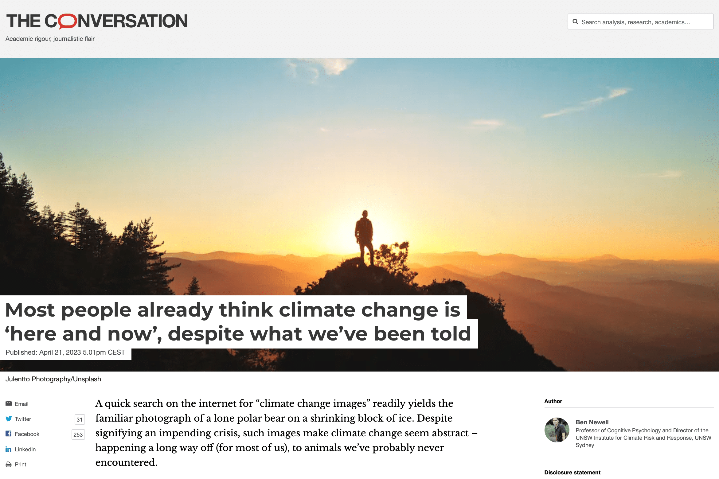 By Ben Newell - The idea that climate change is perceived as “psychologically distant” – happening in the future, in distant places, to other people or animals – has long been presented as a major barrier to action on climate change. Despite the intuitive appeal of this idea, new research published today in the journal One Earth by behavioural scientists at the University of Groningen now challenges it.
