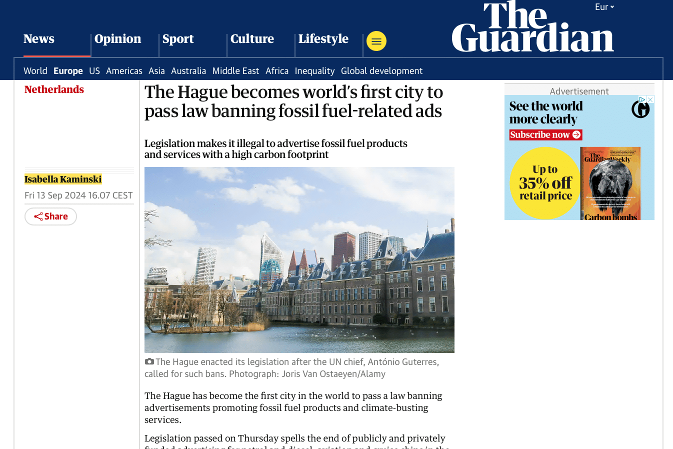 By Isabella Kaminski - The Hague has become the first city in the world to pass a law banning advertisements promoting fossil fuel products and climate-busting services. Legislation passed on Thursday spells the end of publicly and privately funded advertising for petrol and diesel, aviation and cruise ships in the streets of the Dutch city, including on billboards and bus shelters. It takes effect from the start of next year.